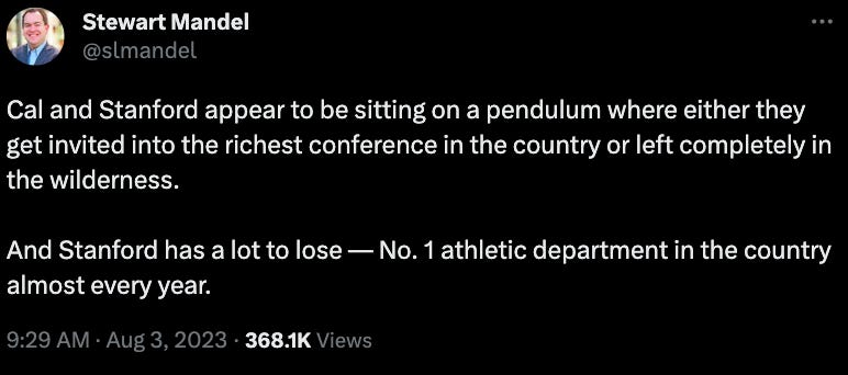 For Stanford, it’d be a pretty tough blow, but they are one of the schools that go fully independent, go to a lower conference, integrate their non-revenue sports into local conferences, likely keep playing Cal and a few Pac-12 schools, Notre Dame, and some other marquee opponents since they are extremely cash positive.