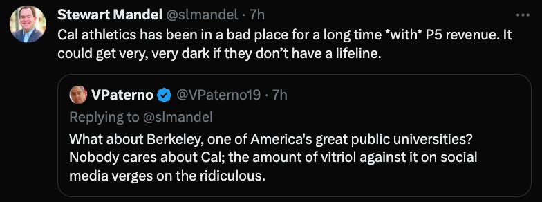 For Cal, it’s a death spiral. If left behind. in what’s left of the tatters of the Pac, they will have to cut back heavily in every sport at every capacity. The proposed Pac-12 deal will do nothing but diminish or vanish entirely without Oregon or Washington. And they still have tons of debt they have yet to pay off from the Memorial Stadium upgrade/SAHPC reconstruction. Even if Cal does get a Big Ten deal at some point in the foreseeable future, the damage caused in the intermediate moments will be so difficult to recover from for years.