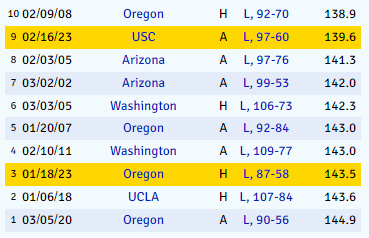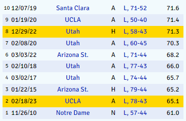 For a better representation of what this season has meant, let’s take a look at some history. Here are the 10 worst single game offensive performances Cal has managed in the Kenpom era (01/02 season to the present):