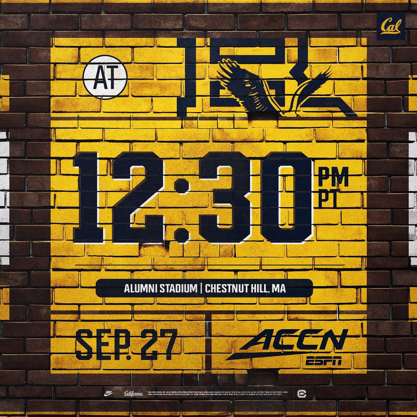 I live 15 minutes away from Boston College (which really is in Chestnut Hill) and am very excited to bring my kiddos to the game. No Cal Band, no Cal Cheer, but the CAA Tailgate sold out in three days! Should be a lot of blue and gold out there :)