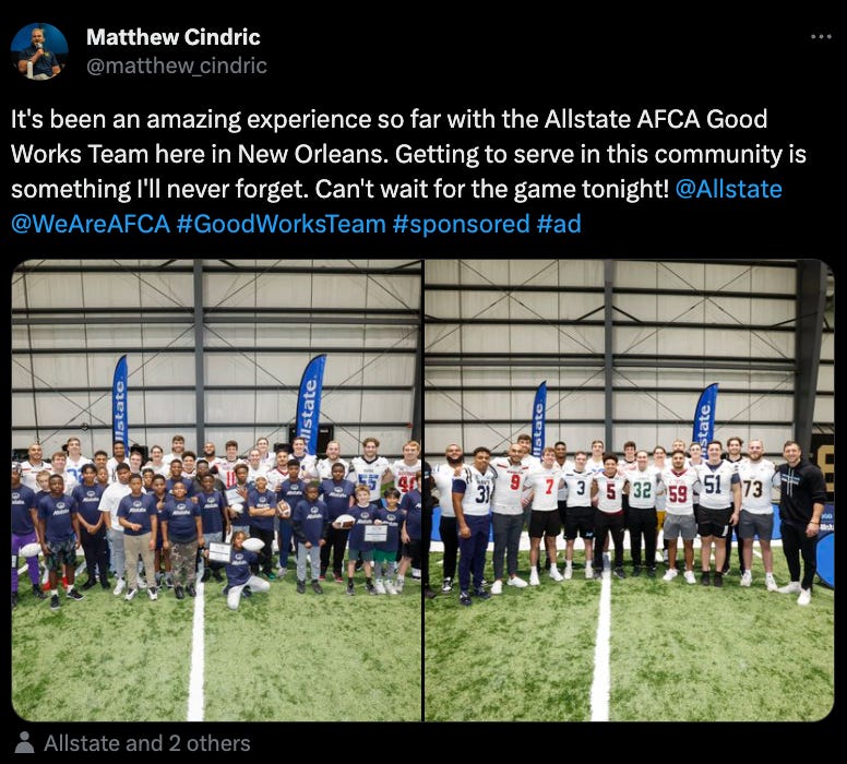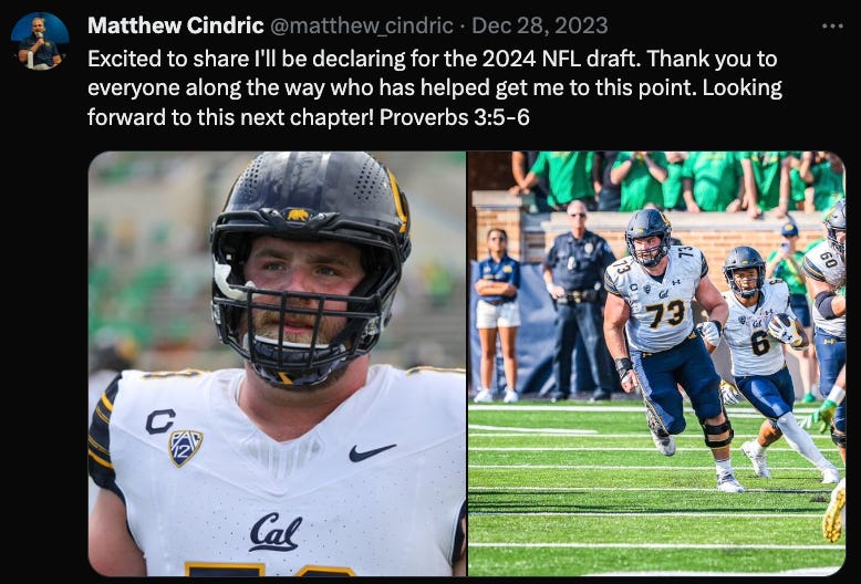 Matthew Cindric didn’t have the tidiest farewell campaign with Cal, as an injury ended his season prematurely. But he still found ways to excel as only a Cal Bear could. On New Year’s Day he was in New Orleans, being honored as a member of the 2023 Allstate AFCA Good Works Team. More video here.