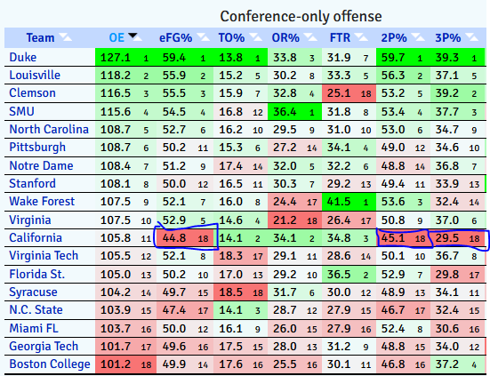 The gap in effective shooting percentage in ACC play between Cal and 16th place Georgia Tech is roughly equal to the gap between 16th place Georgia Tech and 4th place SMU. Cal’s shooting percentage in ACC play this year is lower than the Pac-12 shooting percentages for a couple of Mark Fox teams.
