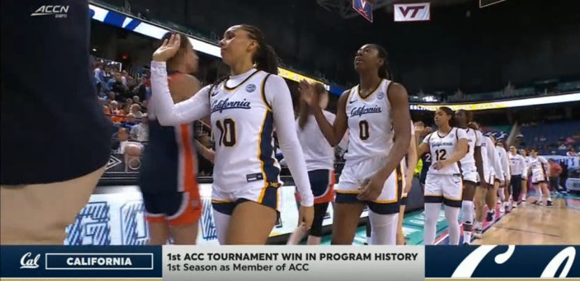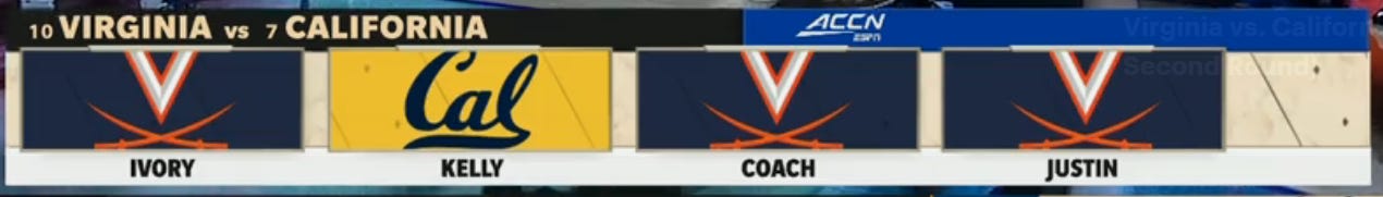 Exactly two weeks ago on February 20th, Cal eked out a narrow 76-70 victory over the Virginia Cavaliers. In that game, Cal trailed at the half but asserted themselves in the third period to take a single point lead into the fourth. Cal extended the lead to seven with just over three minutes left. Virginia rallied, and it was a 3-point game before Lulu Twidale hit a 3-pointer with 15 seconds left to produce the final score. The Cavaliers have not lost since then, going 6-0 including a regular season-ending upset of North Carolina. Even though Cal was the higher seed going into the game and was favored by Vegas, the ACC TV studio crew did not believe in the Bears. Their pregame predictions;