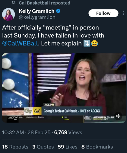 The only ACC TV studio announcer to pick Cal to win was Kelly Gramlich, who has a self-professed crush on this Cal team. At halftime of today’s game with Cal dominating, the three other members of the TV crew issued a mea culpa and let Kelly rave on about the Bears.