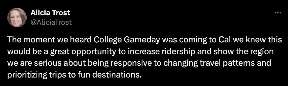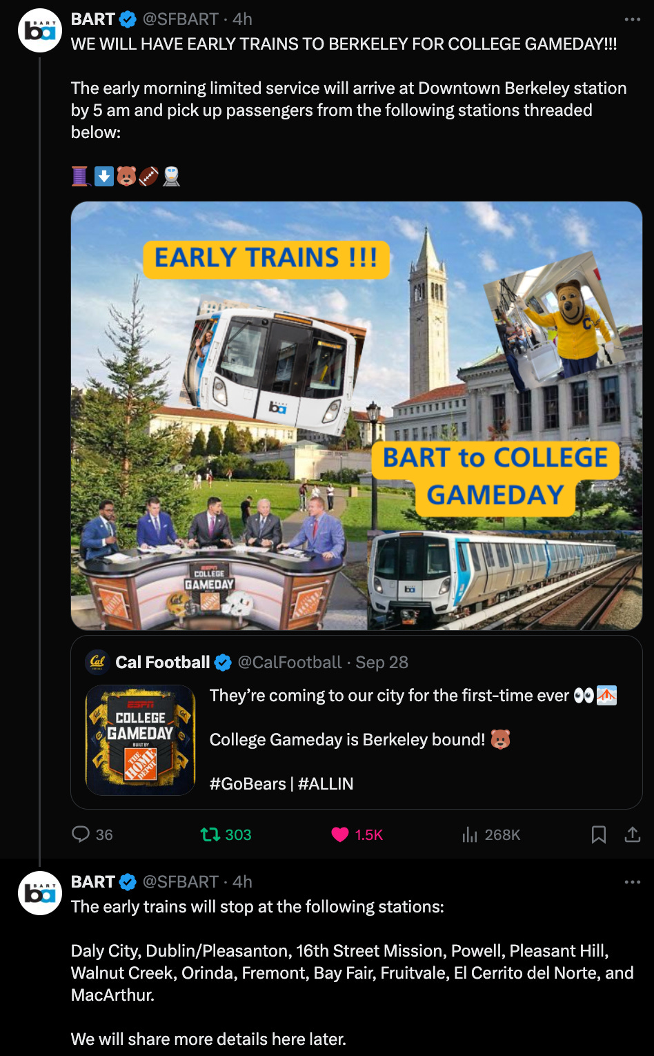 It’s just another incredible win for our Cal fans, and the increasing commitment of Cal Twitter to make College Gameday an incredible experience. Our impact knows no bounds, and we have to thank everyone at BART for making this happen.