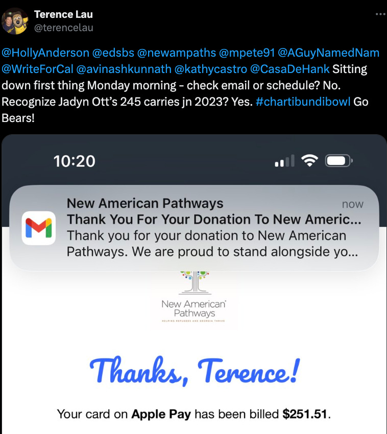 The proceeds go to New American Pathways, whose mission is to help refugees resettle in Georgia where the charity is located. Hundreds of refugees from Afghanistan, Ukraine, Haiti, Cuba, Venezuela, Burma, Syria, Somalia, South Sudan, Ethiopia, and so many other countries have found roots here as a result of the money raised from this charity drive, and already $750,000+ has been raised!