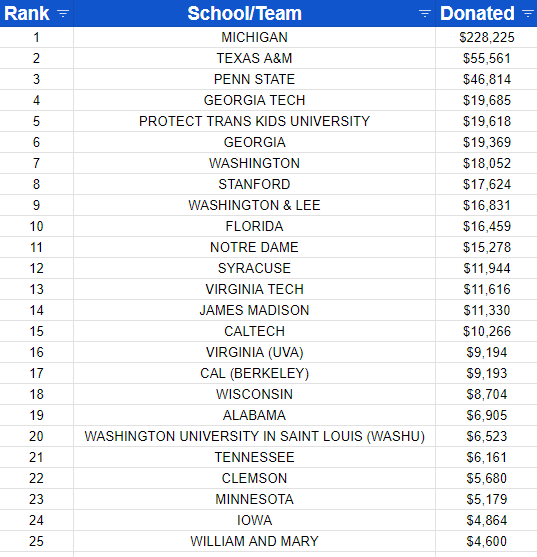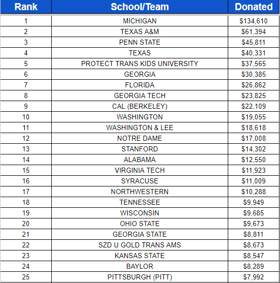 But the big way the charity drive gets it juice is by marking your donation by the school you root for.