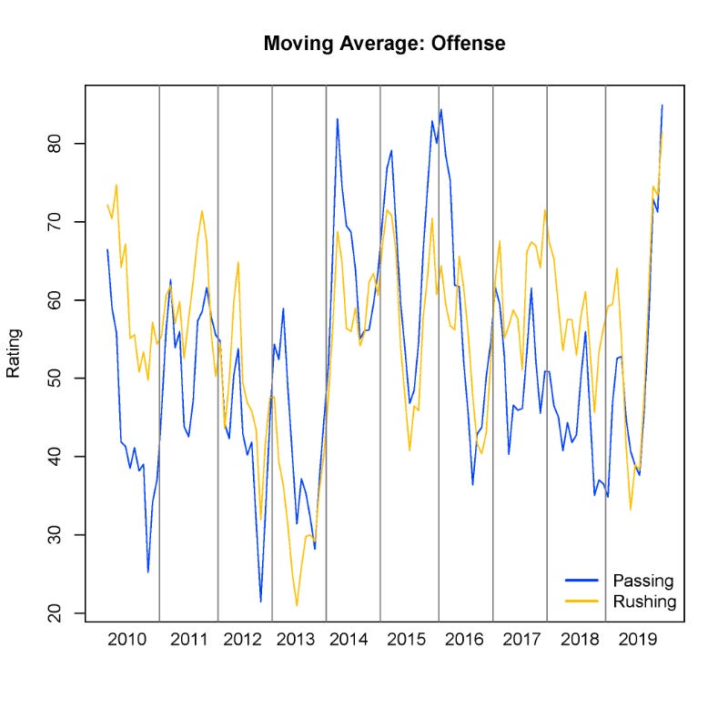 2015: passing - 68.55 (highest of the decade!); rushing - 60.32