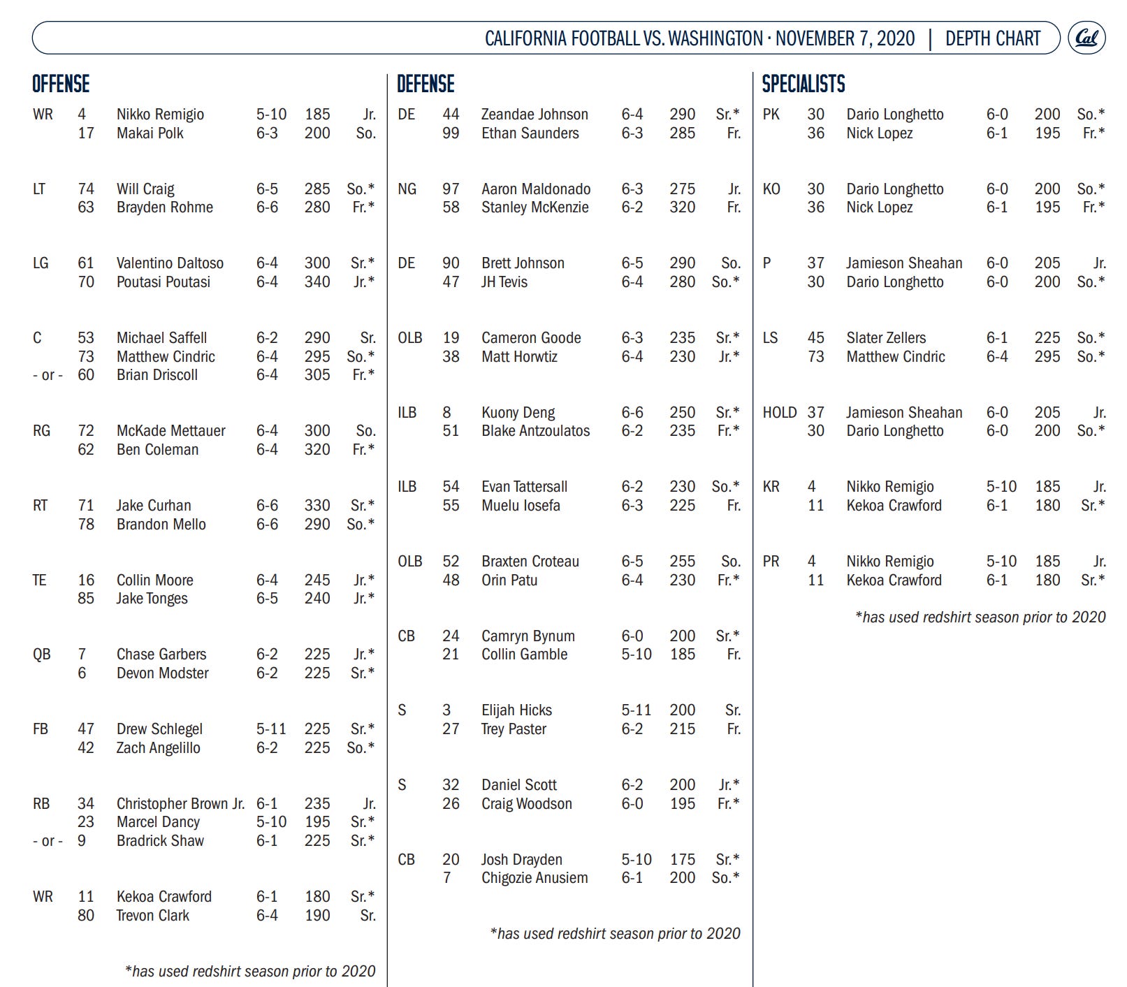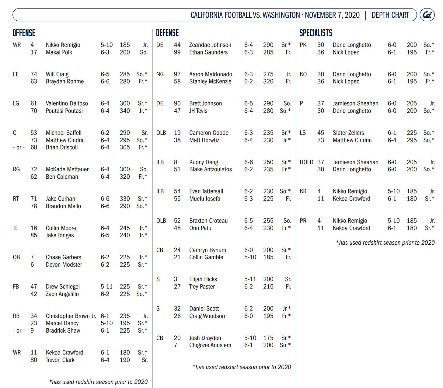 5 True Freshman make the 2 deep on defense: Ethan Saunders at DE, Stanley McKenzie at NG, Muelu Iosefa at ILB, Collin Gamble at CB, and Trey Paster at S.