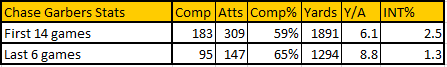 Higher completion percentage, higher yards/attempt, and he halved his interception rate. And importantly: Those last 6 games stats aren’t good just compared to Garbers’ first 14 games. They’re good compared to college football at large. Justin Herbert (currently looking pretty darn good for the LA Chargers) put up 8.1 yards/attempt with a 67% completion rate last year.