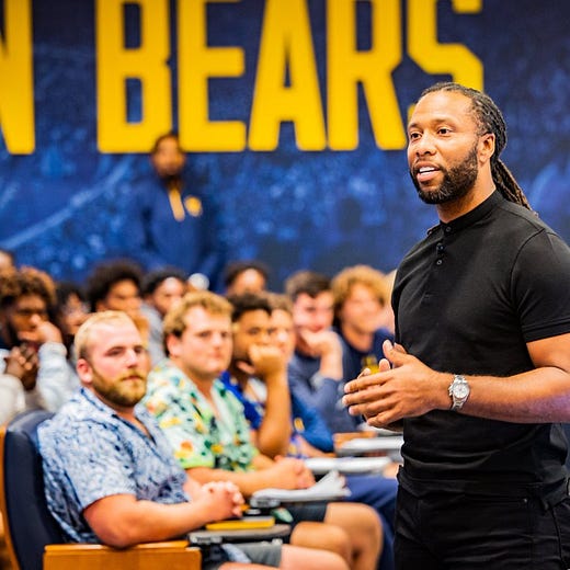 A bit of a different style of notebook. It was a pretty relaxed day of practice on Friday. Lots of walkthroughs and teach periods. The assumption would be that they are gearing up for another day of scrimmage periods on Saturday. The team got a visit from future Hall of Fame WR Larry Fitzgerald on Thursday night, and then got some time with puppies in training to be Guide Dogs for the Blind after practice on Friday.
