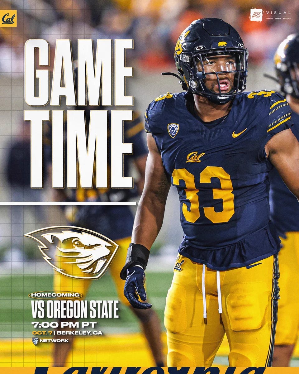 Cal Football 2023: Game Time Announced for Cal v. Oregon StateHomecoming under the lights in BerkeleyRob HwangSep 25, 2023519ShareThe Pac-12 released its TV and Gametime schedule for week 6 of the 2023 College Football season.The Bears are scheduled to host Oregon State on October 7th for their homecoming game, with kick-off set for 7:00PM PT on Pac-12 Network.PreviousNext