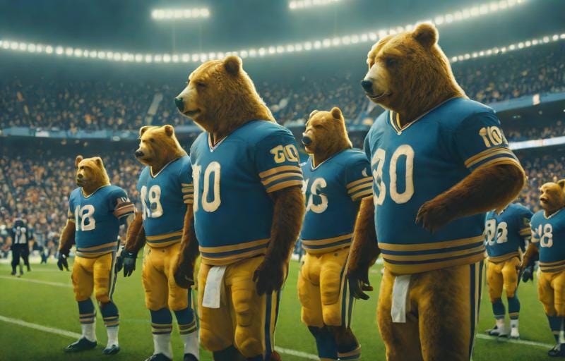 Despite the best efforts of Coaches Wilcox and Sirmon, both highly regarded in the west defensive minds, Cal has seen an overall decline of their defense over the last few years. So I applaud the decision depicted in the lead photo to actually deploy 7 actual bears as their front 7. An obvious solution!
