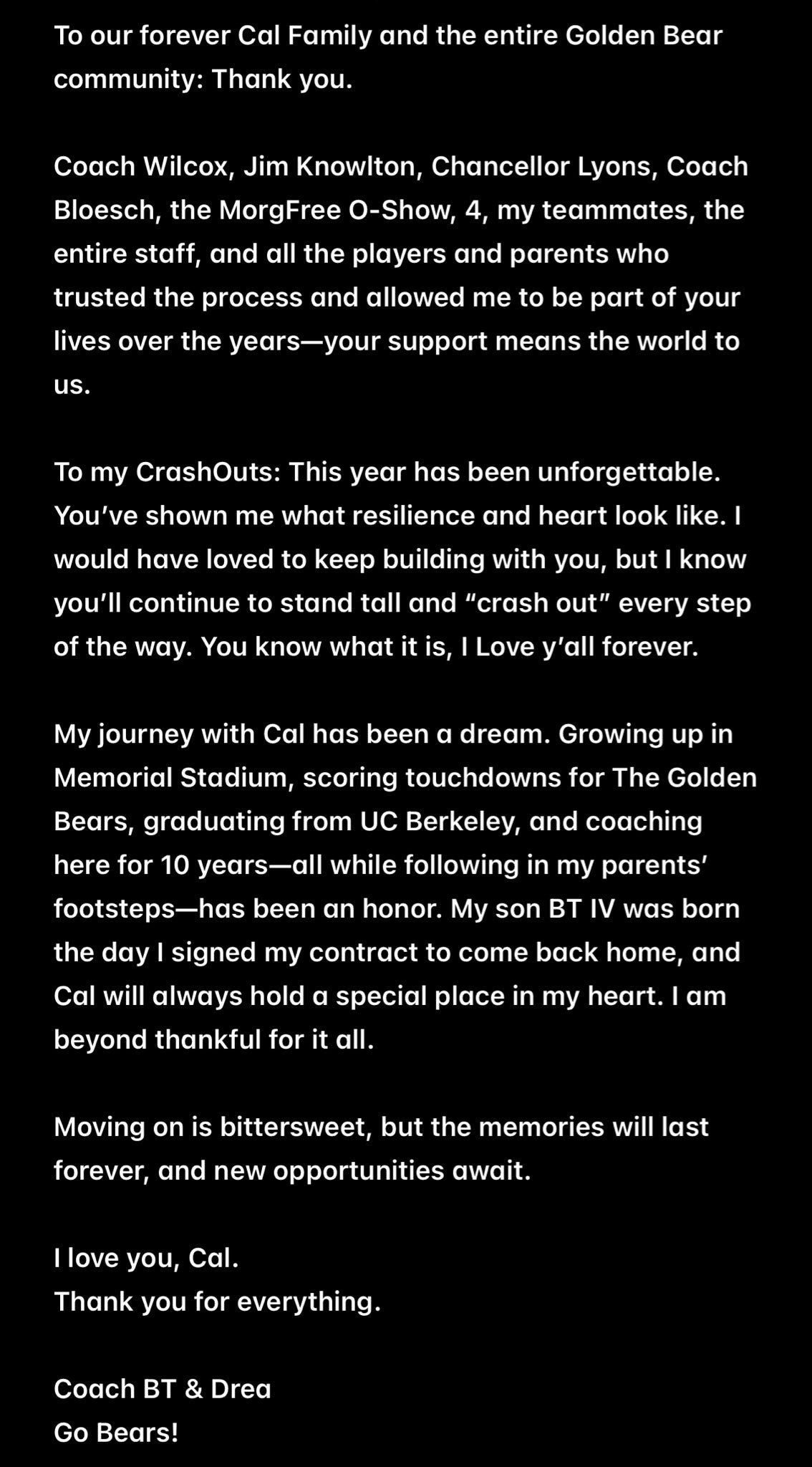 I'm torn about this. I played with his Dad, Burl Jr. The Toler family is just a great family and are Golden Bears through and through. Blll did a great job recruiting. I'm guessing Harsin is meeting with staff and making decisions about who to keep. We need a big change on the offensive side of the ball. More grit and more nasty. I wonder if we will lose any more kids to the Portal with this announcement?