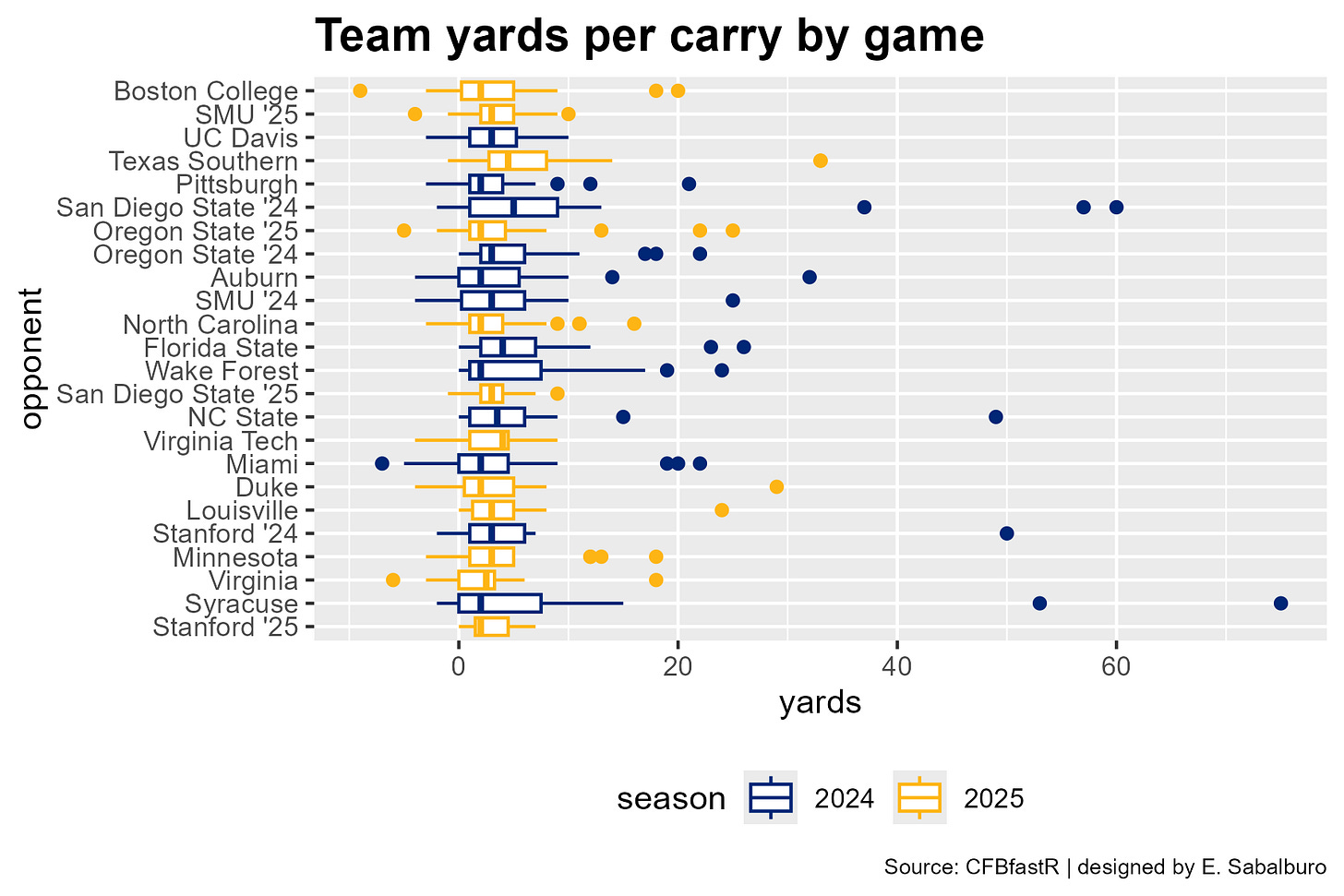 Kinda fun to see that the 2025 season finale against SMU takes the #2 spot for carries per game, while the Big Game loss this year takes the bottom spot.