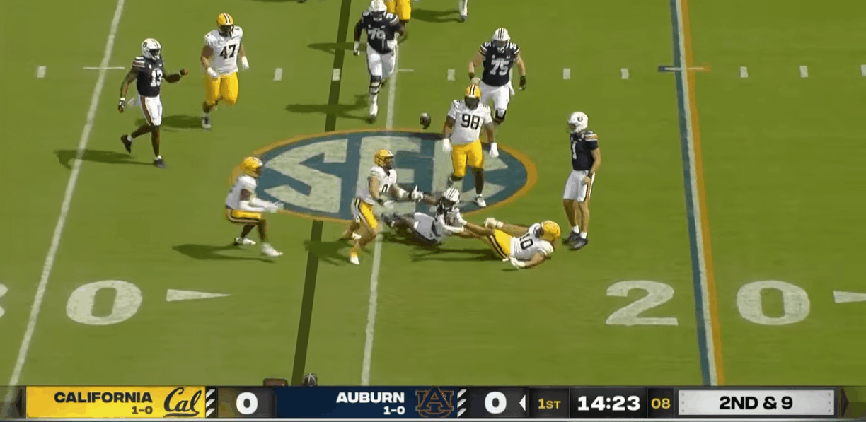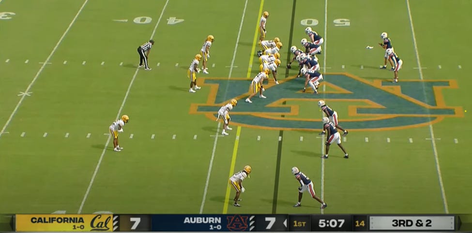 For example, take this play in the 1st quarter at Auburn. Cal had been playing base 3-4. If you’re an opposing QB, it looks like a 3-4 with an inside backer walked forward. Check again. That’s a 2-5 personnel package with two interior linemen and five linebackers. The two OLBs (Carlton and McCulloch) are playing on the line but appear lined up inside the tackle, essentially playing defensive linemen for this particular play. Buchanan is playing middle backer next to a safety, and Uluave and Barth are lined up as twin outside linebackers.