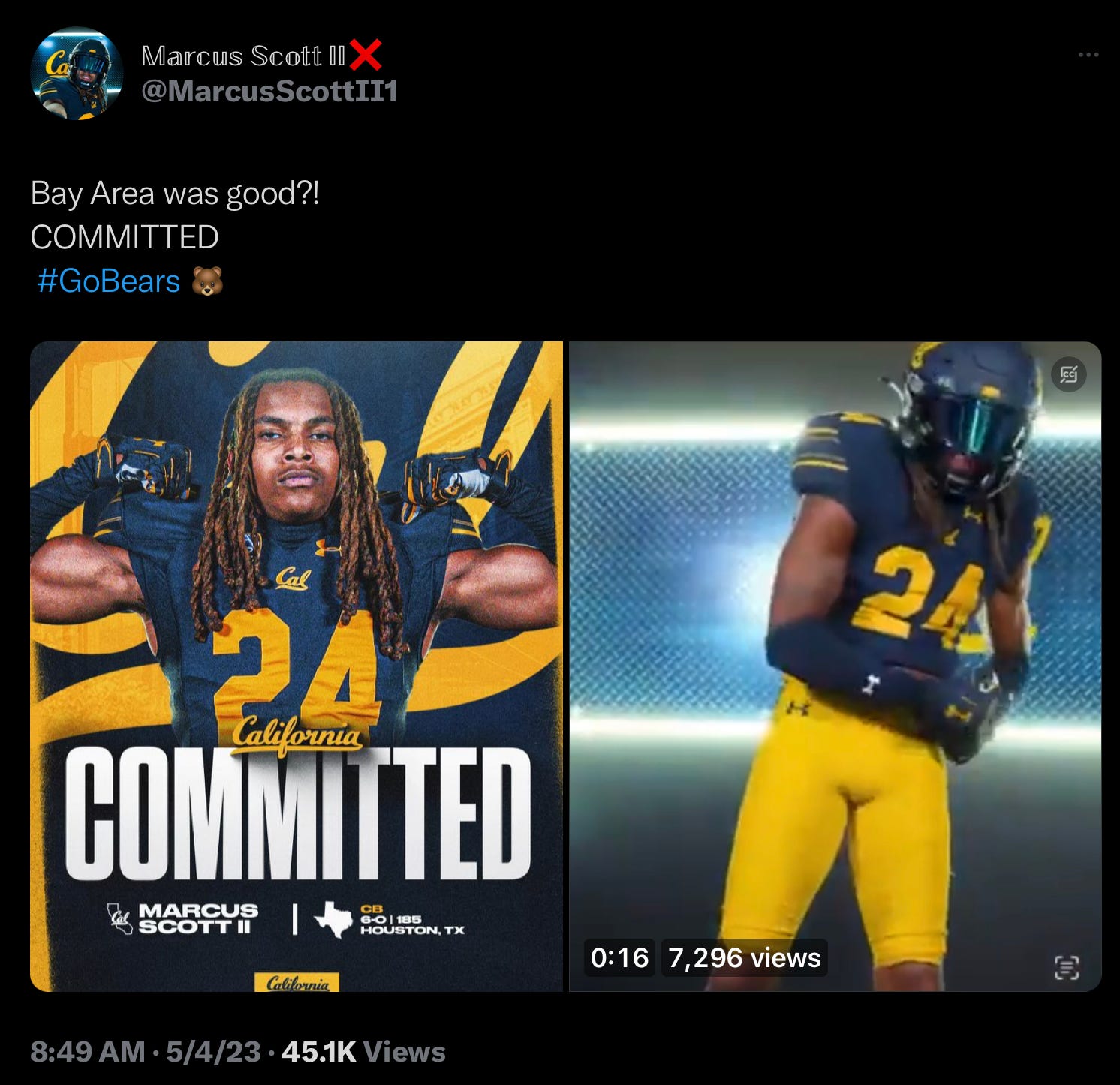 Cal Football added another potential starter to the DB room in Missouri transfer DB Marcus Scott II. The 6’2” corner comes from Conroe High School in Conroe, Texas and was a 247 Composite 4-Star in the 2022 class. He was ranked as the 40th best cornerback in the country on 247, while on Rivals he was rated as the 31st best corner. He held offers from Missouri, LSU, Houston, Texas Tech and others coming out of high school.