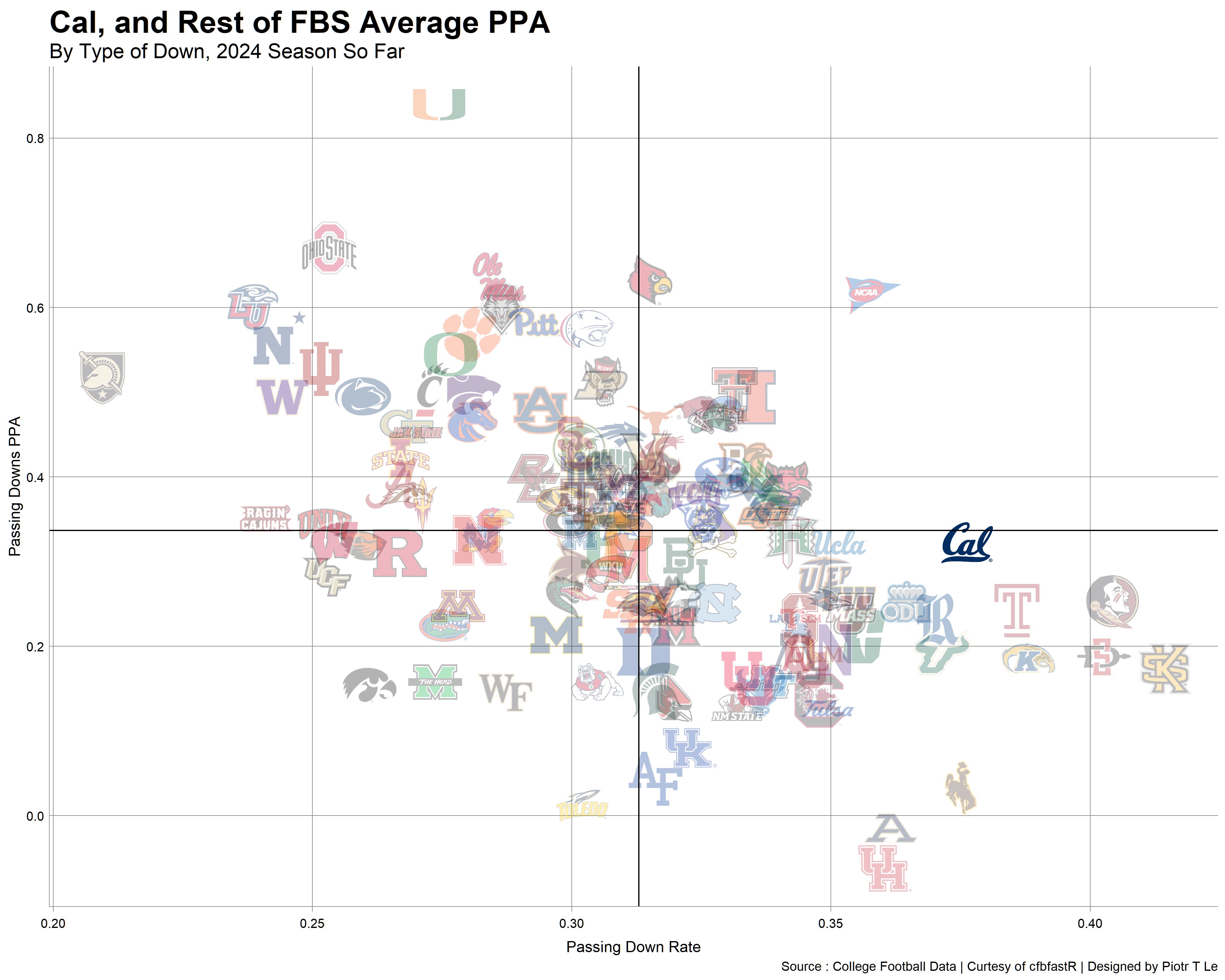 Cal puts itself in a terrible situation by facing passing downs at one of the highest rates in college football this season. From the looks of it, it can be worse considering the rest of the teams we have in the same realm of the passing down rates. However, we’re dealing with them so often that being slightly mediocre in these situations keeps us ineffectual down by down case.