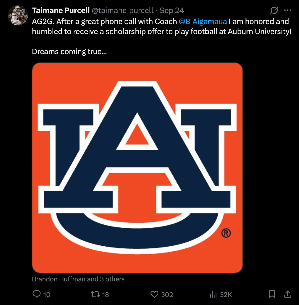 Taimane Purcell - TE - Kamehameha (Honolulu, HI) – On September 24th, TE and Cal commit, Taimane Purcell announced on X that he had received a scholarship offer at Auburn, his third SEC school to give him an offer, but the first since he’s committed to Cal and earned a 4-star designation on 24/7 sports and an 88 overall on on3.