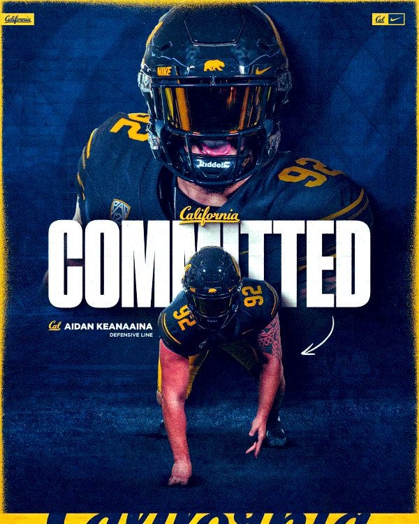 Late this morning, Cal got a comittment from Aidan Keanaaina, a defensive tackle who was last with the Notre Dame Fighting Irish. Keanaaina, a rotational defensive tackle with the Irish, appeared in six games and totaled seven total tackles, 1.5 tackles for loss, and half a sack. He looks to be pursuing a masters in public health at Cal.