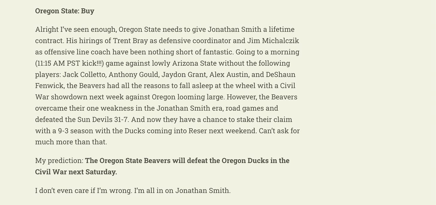 Along the margins, there arenโt many other teams Iโd want over Oregon State. They do so many things fundamentally well, from shedding blocks and getting to the second level, to the patience and vision of skill position players, to the swagger the defense plays with at Reser stadium. I thought the same thing back in 2021 when the Beavers visited Berkeley, then Cal hung 39 points on them. Shows what I know. However, these thoughts still remain. Thereโs no reason why OSU canโt be a 7-9 win team again this season if they can continue to win along the margins. Helping that campaign will be the full completion of Reser Stadiumโs redevelopment, allowing for full capacity crowds as the third down saw noise rings out. I must also admit I am jealous of the Bay Area footprint they have in recruiting.
