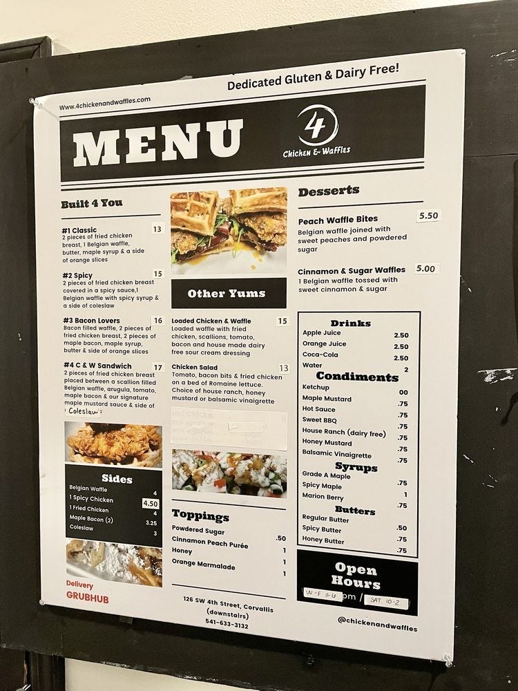Go-to restaurant if you’re going to the game: You can get gluten-free chicken and waffles at 4 Chicken and Waffles in Downtown Corvallis. Rated 4.9 stars on Yelp, which feels like a trap, but the reviews seem legit!
