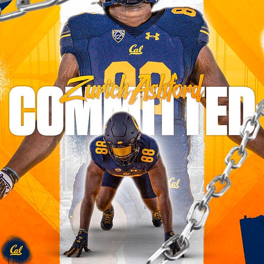 Cal Football receives the commitment of 3 star Defensive Lineman Zurich Ashford. The 6-foot-3 and 260 pound lineman got his offer from the Bears just 4 days before his commitment.