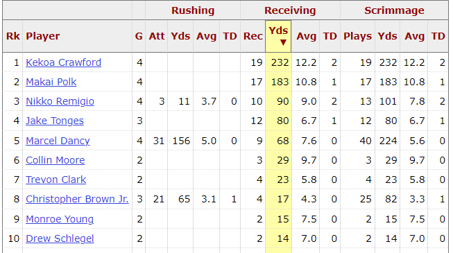 The starting WR trio will remain the same: Kekoa Crawford (#11), Nikko Remigio (#4), and Trevon Clark (#80). Behind them is the 2nd year duo of Jeremiah Hunter (#10), Justin Richard Baker (#22), and 3rd year man in Monroe Young (#14).