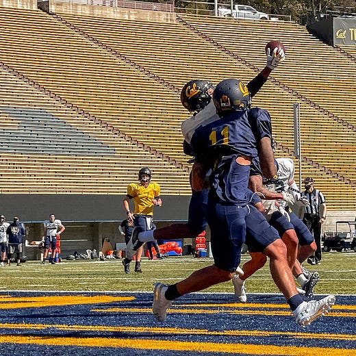 Cal Recruiting’s recap video of the scrimmage offers some more information. At 15 seconds, CB Collin Gamble practices punt returns. At 34 seconds, RB Chris Street takes a handoff from Garbers and squeezes through the offensive line. At 45 seconds, TE Jake Tonges makes a one-handed grab against S Daniel Scott. At 49 seconds, Baker hauls in a fantastic touchdown from QB Robby Rowell against CB Kaleb Higgins.