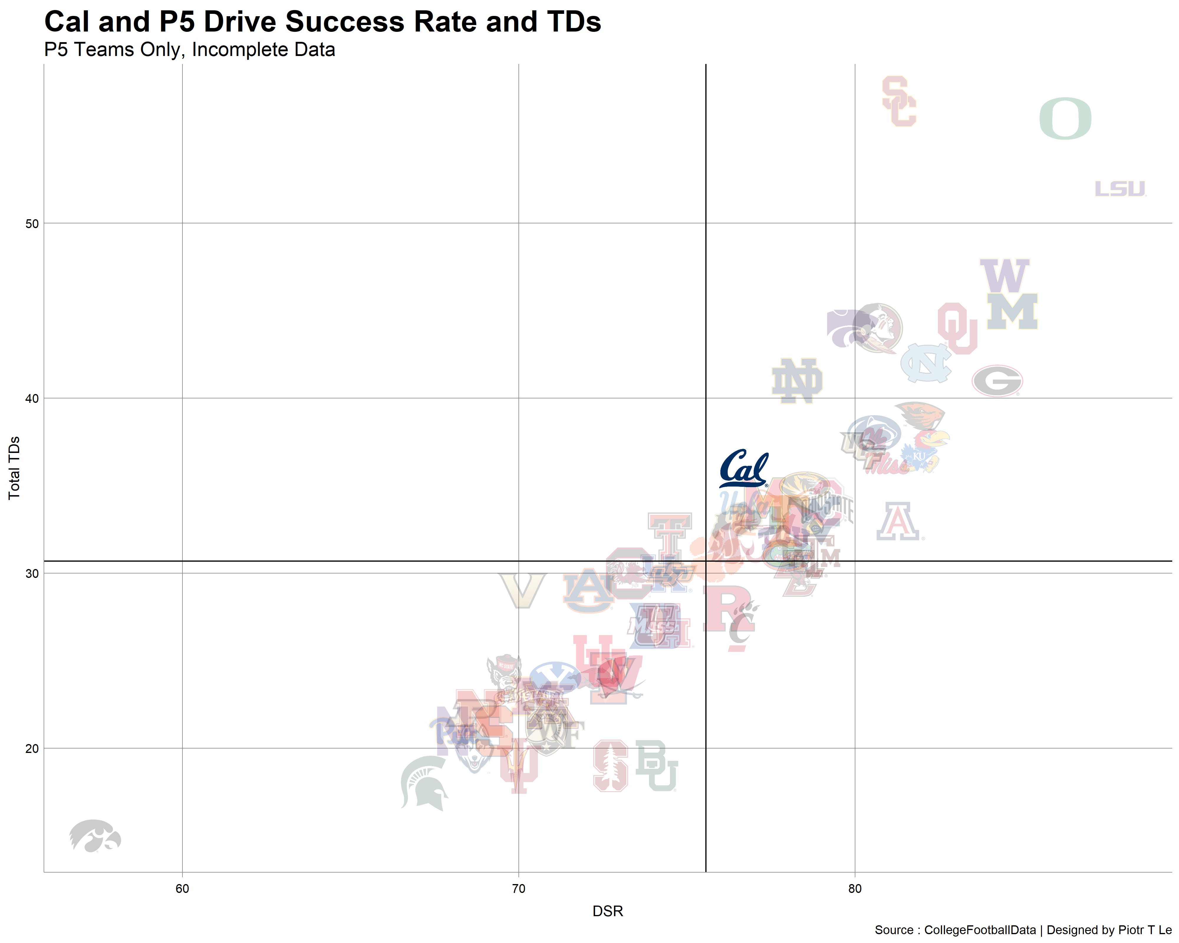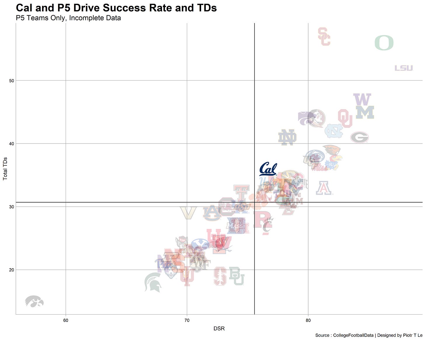 On a positive note, I think for the first time in the Wilcox era we’re a slightly above average offense on a down conversion and TD basis. For the rest of the season we will finally face teams worse than us on this chart.