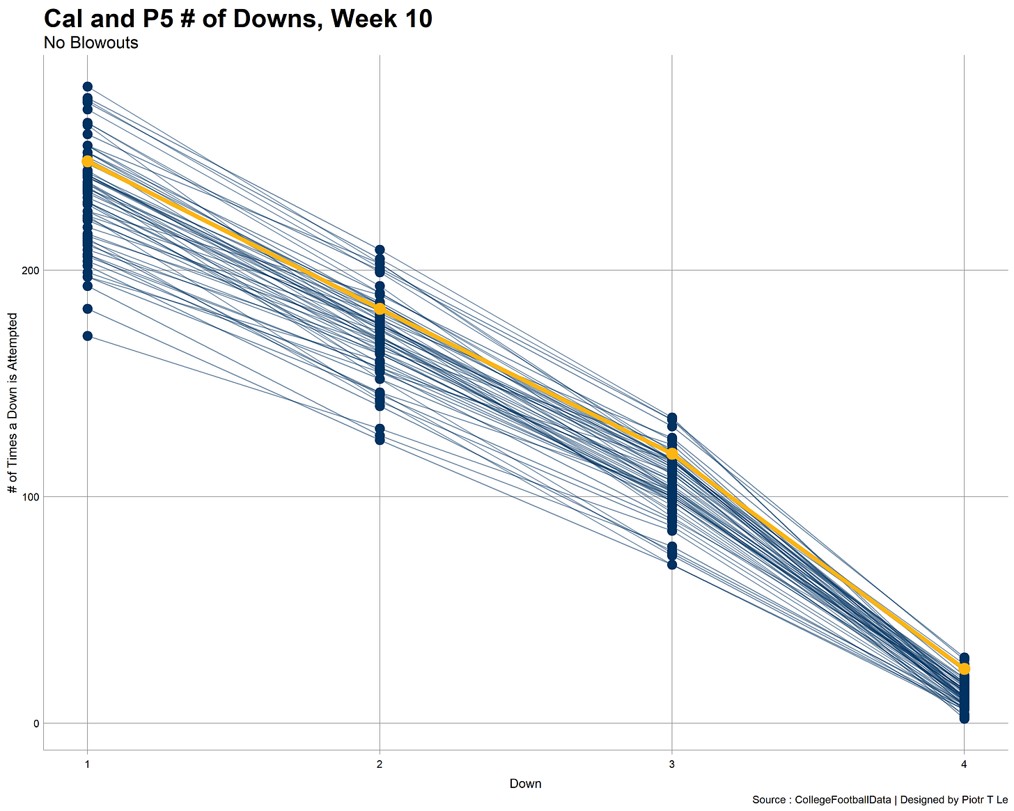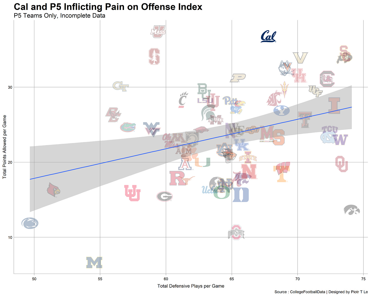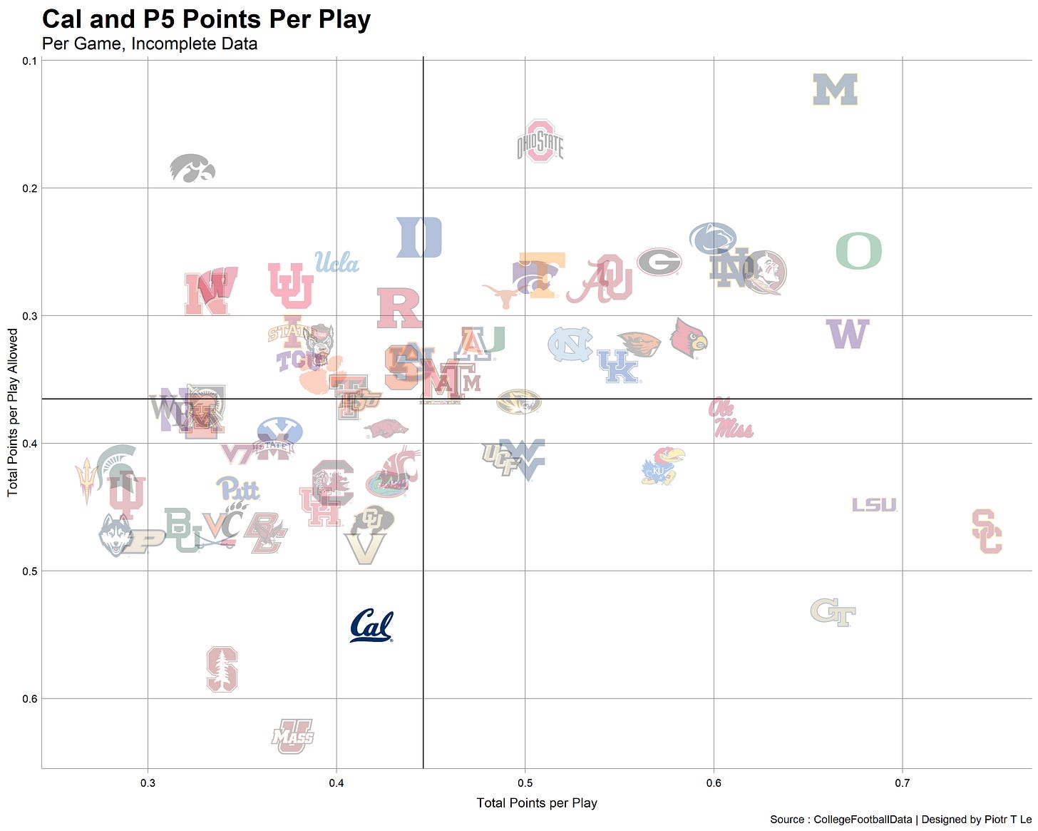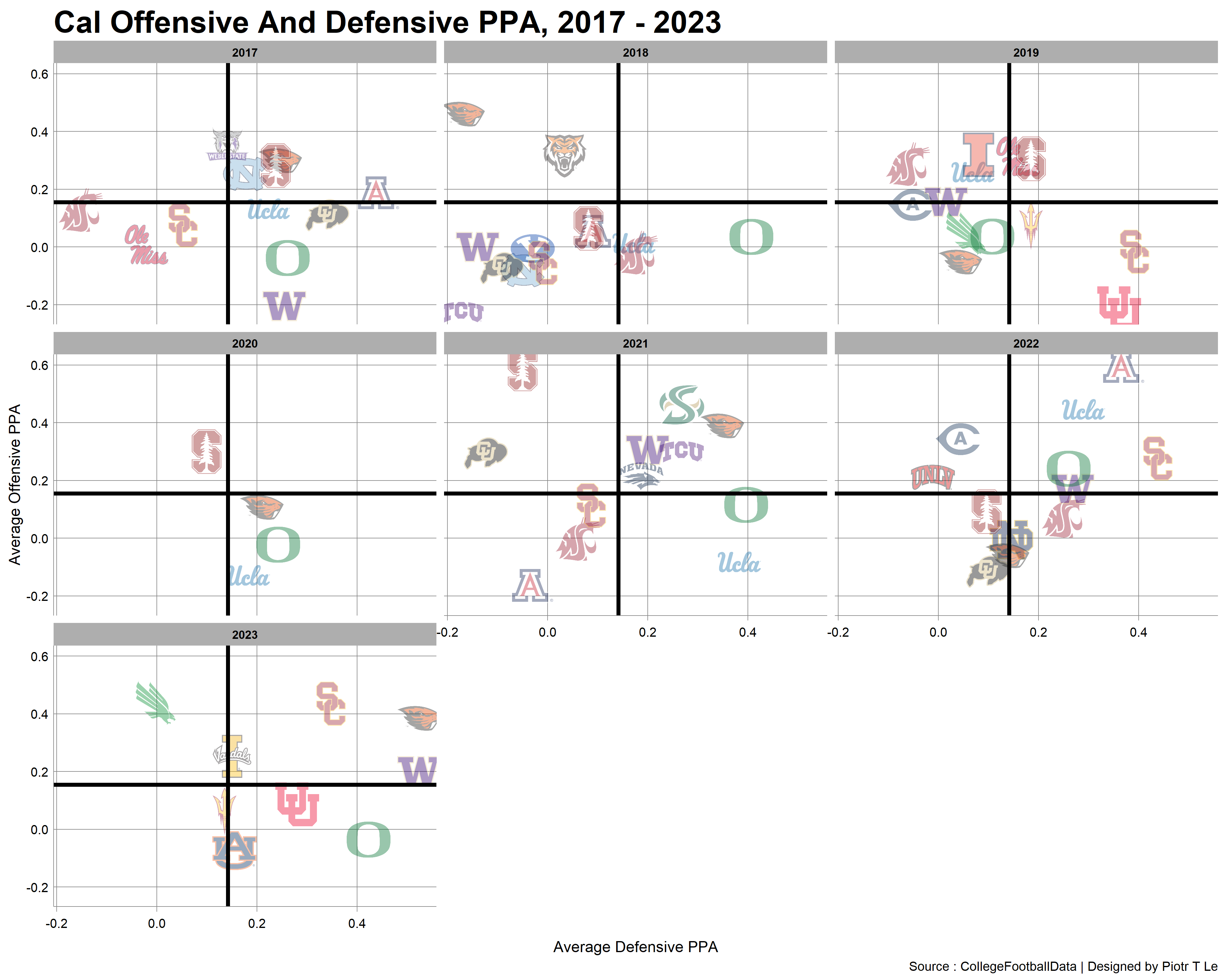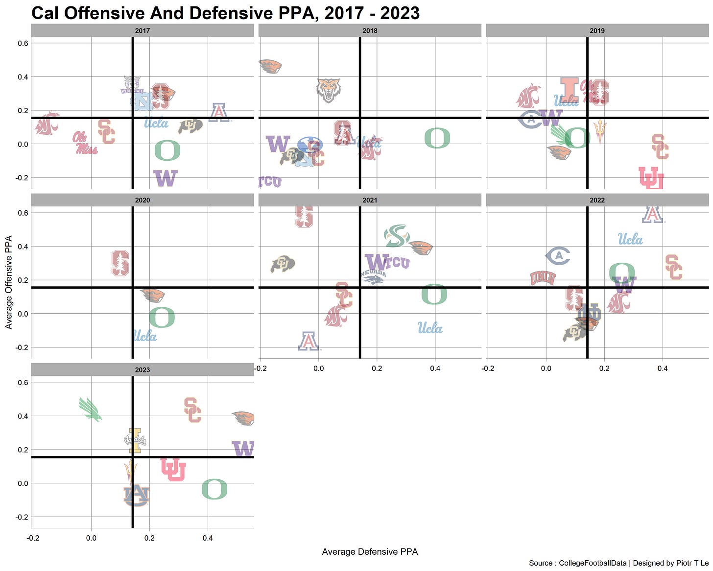 We can see on both parts of the chart Cal has been moving towards have worse and worse performances on defense and a mixed bag on offense with the nadir of 2018. Oregon remained Cal’s kryptonite on both sides of the ball with one decent performance on defense in 2019. (My theory is that they have their own Stallions situated at Berkeley stealing our signs).