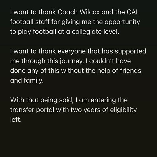 Cal Sophomore Tight End Keleki Latu entered his name into the transfer portal early this afternoon and confirmed his intentions in a twitter post this evening.