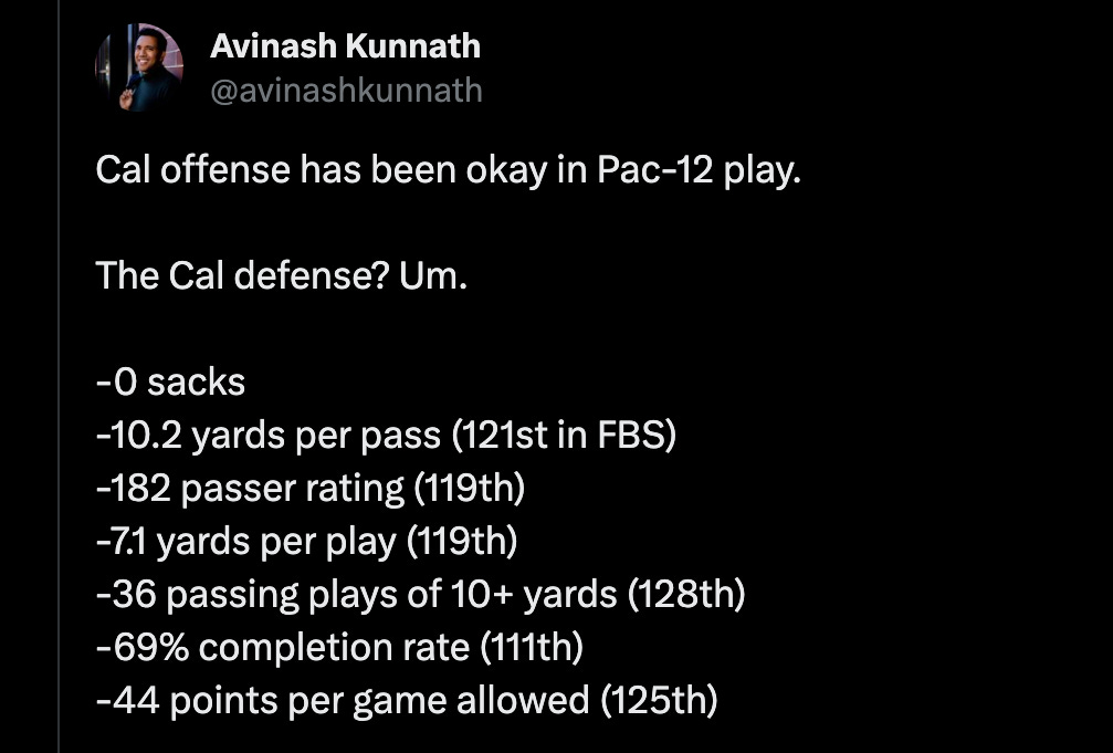 It’s naive to think sacks are the be-all end-all when it comes to a measure of a defense’s success. Take a look at the 2021 Tampa Bay Buccaneers, who were a run-stuffing machine that assisted their 3rd and long defense. But for the Bears to not register a single sack through three conference games, where they’ve had 45, 21, and 52 points hung on them? Not good enough in any respect. Michael Penix Jr and DJ Uiagalelei could’ve cooked a five-course meal back in the pocket, and when you consider the aforementioned stellar quarterback play, talk about throwing kerosene on the fire. Add in the 69% competition percentage and 182 passer rating given up, and it’s been a house of horrors. Cal’s run defense has actually been fine, giving up only 116 yards per game, 137 in conference versus 95 during non-conference play. Despite being ranked 50th in DFEI, the perceptions and trends for the defense aren’t heading in the right direction.