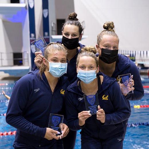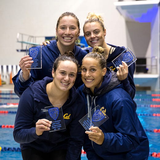 The Pac-12 Championships started on Wednesday, Cal finished 3rd (behind Stanford and USC) in 200y Medley Relay and placed 2nd (behind Stanford) in the 800y Free Relay. Golden Bears also had no divers in the 1-m diving event.