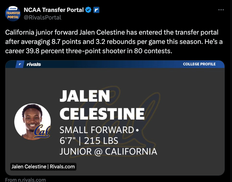 Sadly, after a nice rebuilding season, all the news in the last month for Cal men’s basketball has been not great. Jalen Celestine reportedly is in the transfer portal. Celestine averaged 8.7 points and 3.2 rebounds per game this season, and is a 40% three point shooter in college.