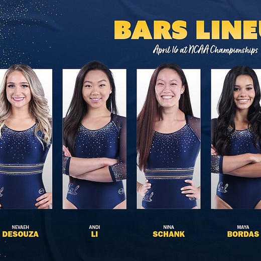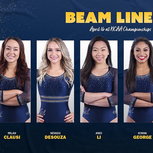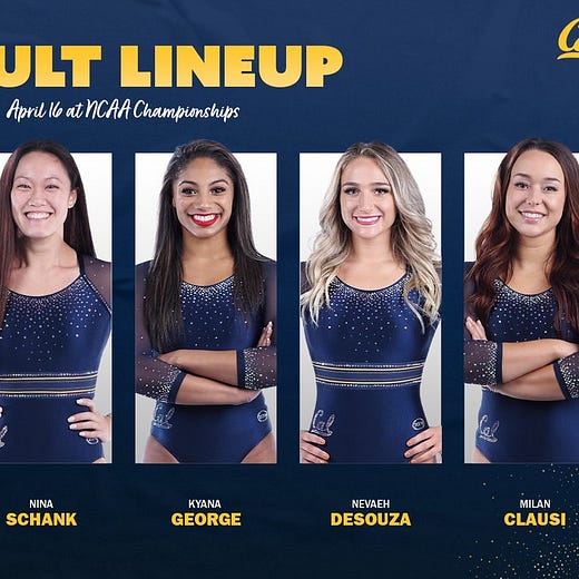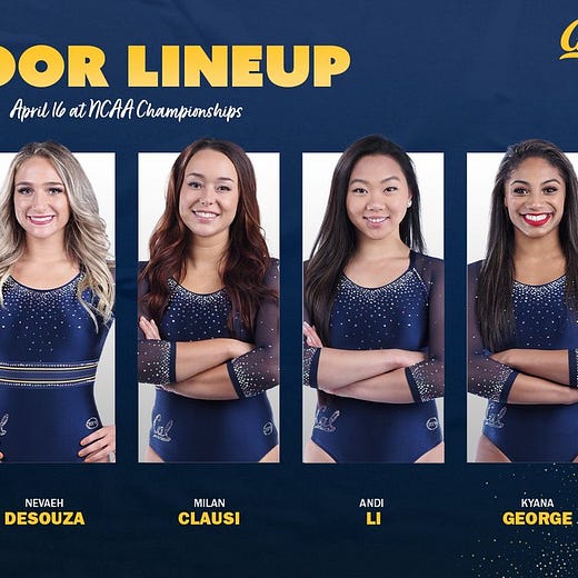 While the Golden Bears are probably a slight underdog of claiming one of the two available spots from Session I against No.1 Florida, No.4 Michigan, and No.8 Minnesota, Cal’s Regional Final score that was just behind that of Michigan (at the same meet, scored by the same judges) was actually ahead of the scores by Florida and Minnesota (following the same scoring rubrics but at a different NCAA Regional).