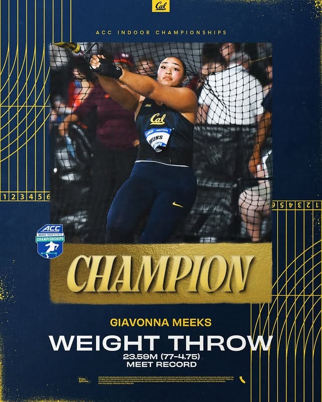 Continuing the new tradition of great female weight throwers at Cal, Giavonna Meeks is a redshirt sophomore who transferred to Cal from Vanderbilt. She placed 6th at the 2024 NCAA Indoor in weight throw. In 2025, she earned the ACC title with a season-best throw of 23.59m/77-4.75. Last Friday, Meeks’ top throw of 23.00m/75-5.5 broke the facility record and earned her a 4th place finish, good for a 1st-team All-American honor.