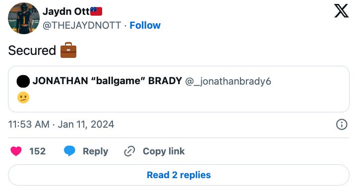 Brady overlapped with Jaydn Ott at Bishop Gorman High, and Ott was one of the first to reach out to his former teammate this offseason. The hustle all paid off.