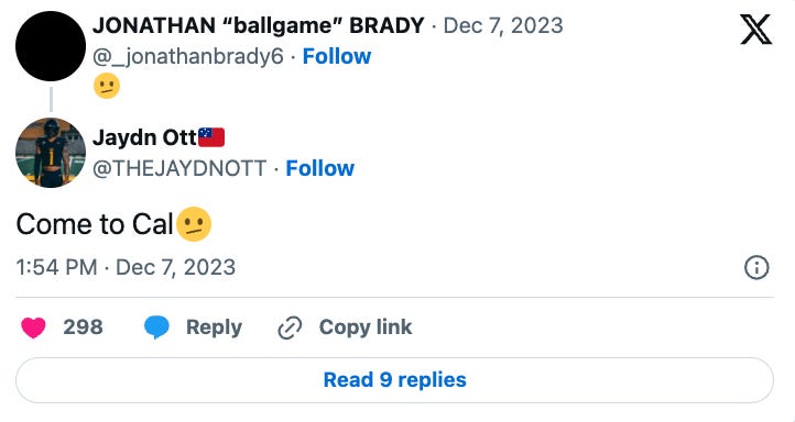 Cal now has three starting caliber wideouts via the portal, as Brady joins Notre Dame transfer Tobias Merriweather and Utah transfer Mikey Matthews. Cal looked for speed and YAC in the portal, and all three wideouts fit the bill.