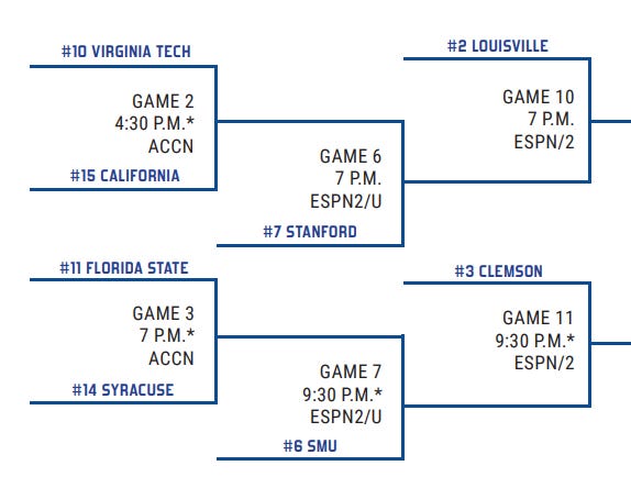 Virginia Tech is actually a pretty favorable draw - the Hokies are probably the worst of the log-jam of teams tied at 8-12, and Cal probably should’ve beaten them in their only matchup this season back in mid January. Stanford annoyingly would be next, and the prospect of going 0-3 against the Cardinal is distasteful. Still, we’ve seen Cal play close with Stanford already this season. I wouldn’t call a run to the ACC quarterfinals likely by any means, but it wouldn’t exactly be a huge surprise either.
