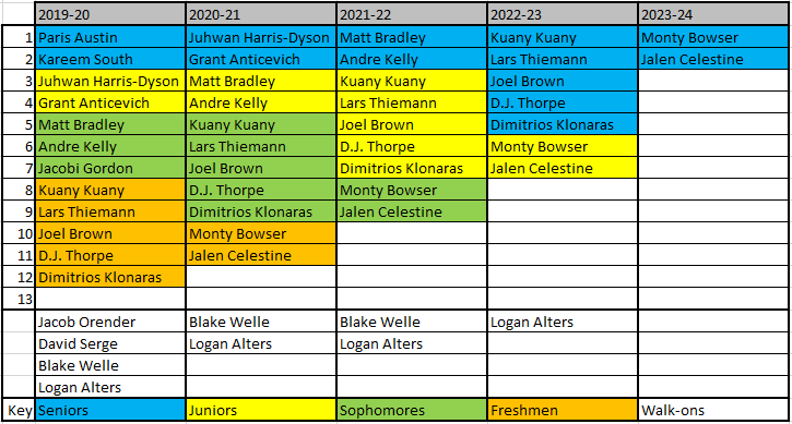 Who’s going to step up to play major minutes on the wing? Kareem South’s 30 minutes/game need to be filled, and the candidates are a variety of players who are either brand new to the program or played very limited minutes last year. Kuany Kuany and/or a grad transfer are my best guess, but that’s all it is.