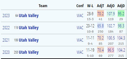 Utah Valley stats: rows are in reverse chronological order - 2022-23 at the top, 2019-20 at the bottom