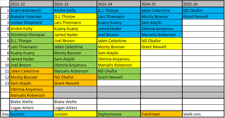 Centers/Posts: Andre Kelly, Lars Thiemann, D.J. Thorpe, ND Okafor