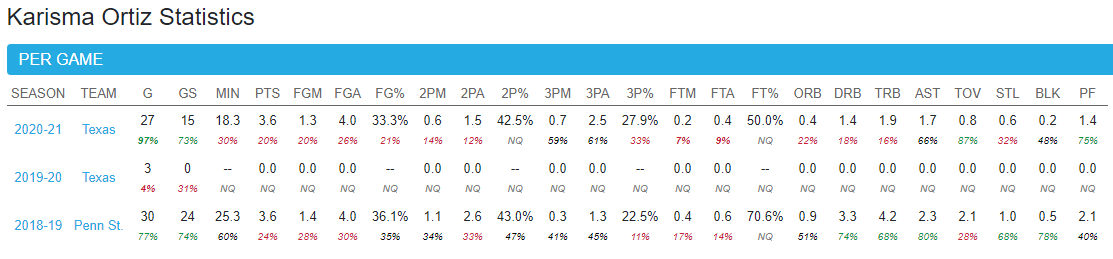 Cal WBB’s transfer pickup, Karisma Ortiz, primarily played off the bench for the Longhorns, playing 18 minutes/game as a low usage ball handler and passer. The fact that she played so many minutes despite iffy shooting would indicate that Texas very much appreciated her ball handling and defense, and sure enough she put up twice as many assists as turnovers on a Texas team that hung their hat on defense (12th in the nation in points allowed/possession):
