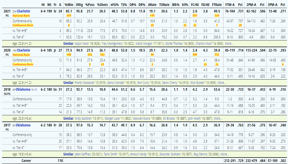 On the concerning side, the bulk of the evidence suggests that Shepherd isn’t really a shooter. Charlotte is one of the slowest teams in the country, and I get the sense from Charlotte’s overall profile that Shepherd had the ball in his hands with the shot clock running down and few options around him frequently, so I’d speculate that some of his bad shooting over the last two years is maybe because somebody had to take a shot.