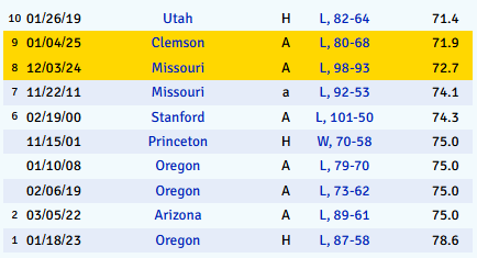 The problem is that Cal’s aggressive doubling/help defense left guys wide open, and Clemson took full advantage. The Tigers shot 8-18 from three on a series of looks that ranged from wide open to absurdly wide open, and also shot an insane 23-32 (72%) from 2. If you’re curious, here are the 10 games since 1997 in which Cal’s defense allowed the highest 2 point shooting percentage: