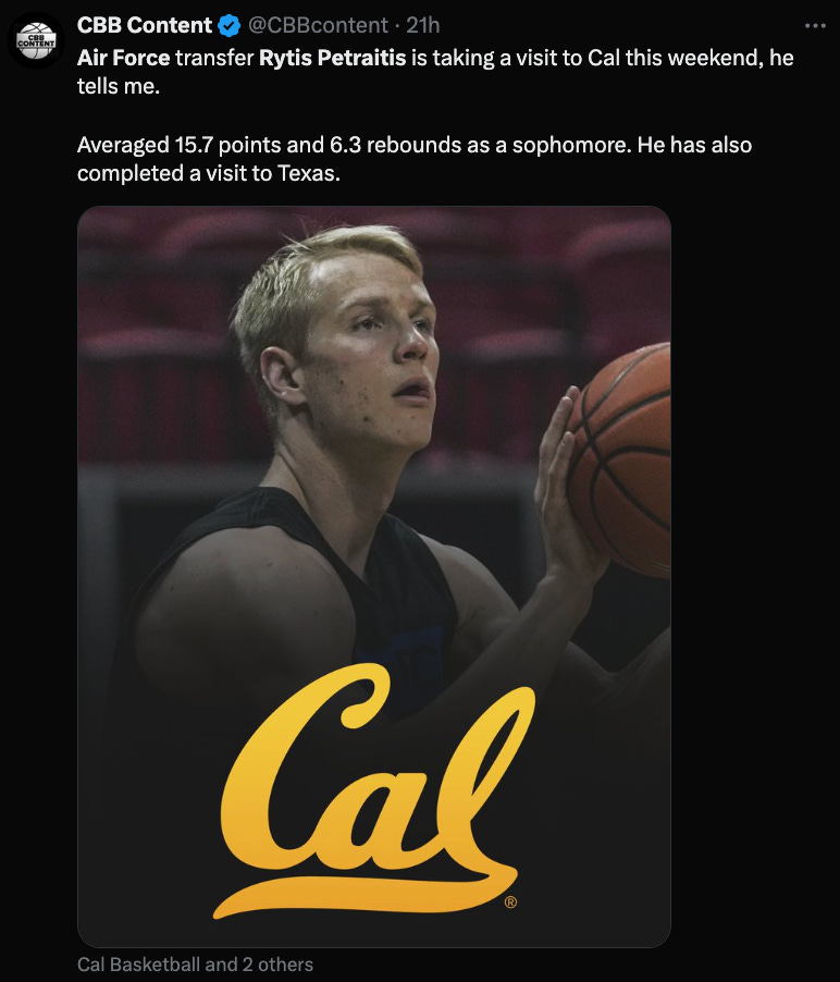 Cal is reportedly getting a visit from Air Force transfer Rytis Petraitis. Petraitis is one of the top prospects in the portal.