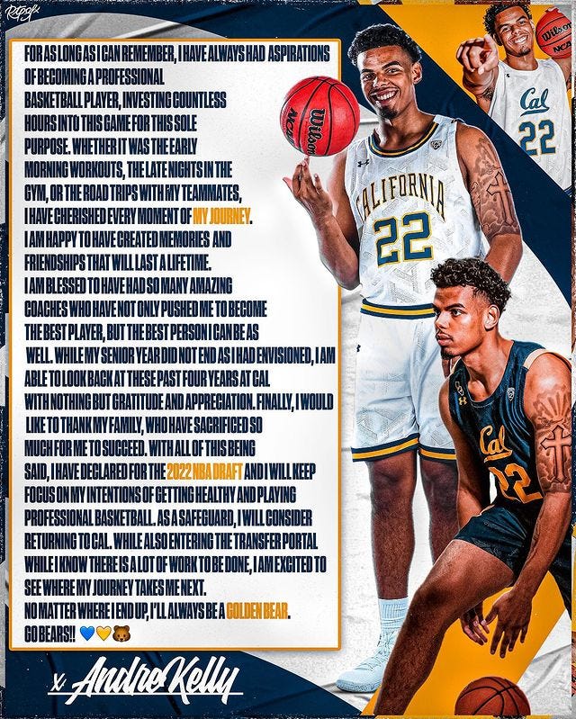 Cal Senior Forward Andre Kelly has declared for the NBA Draft and entered the Transfer Portal. It is likely he did both to keep his options open if he doesn’t get the positive feedback for the 2022 NBA Draft. It’s also noted that he will keep his options open and a return to Cal is not out of the question.