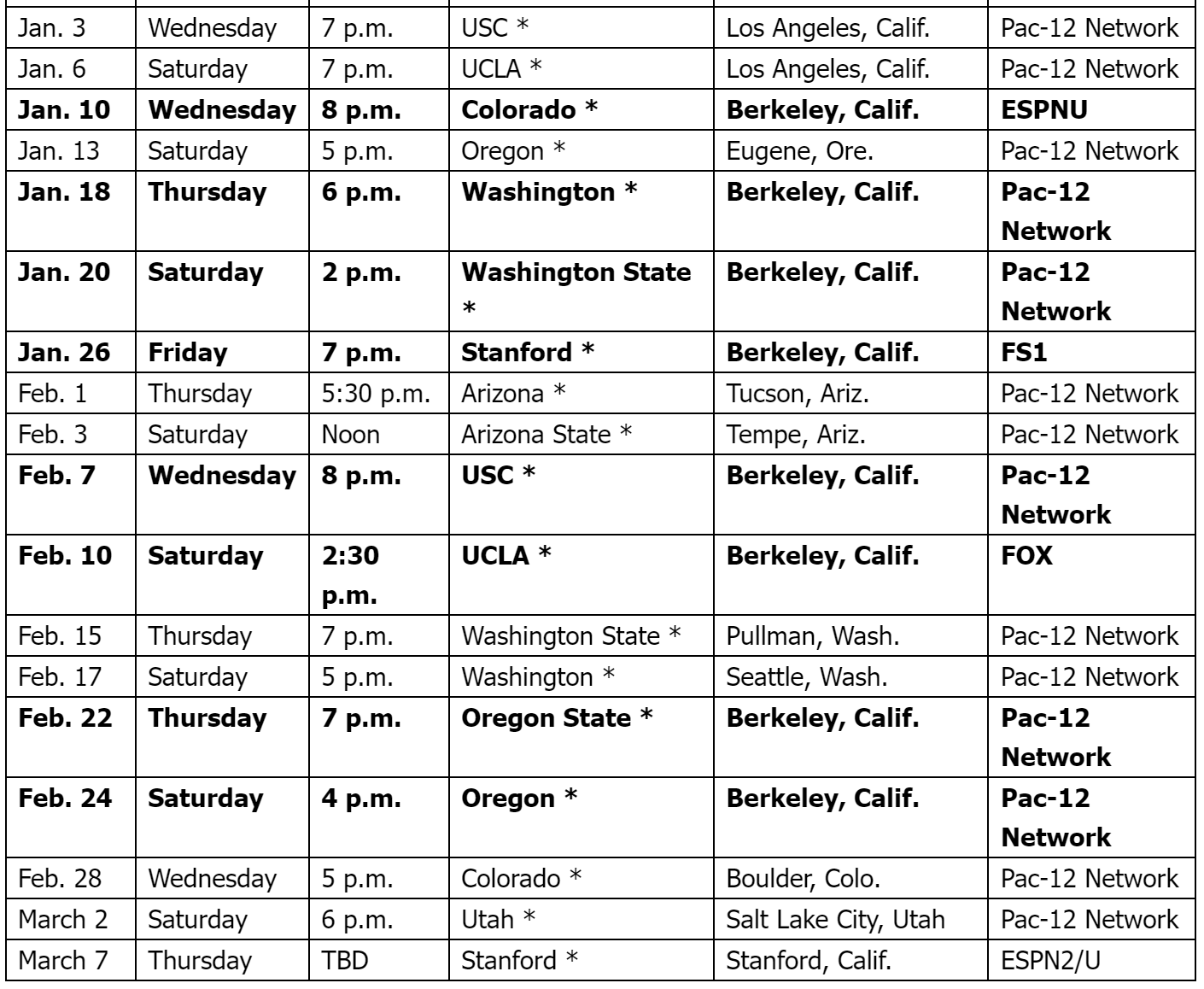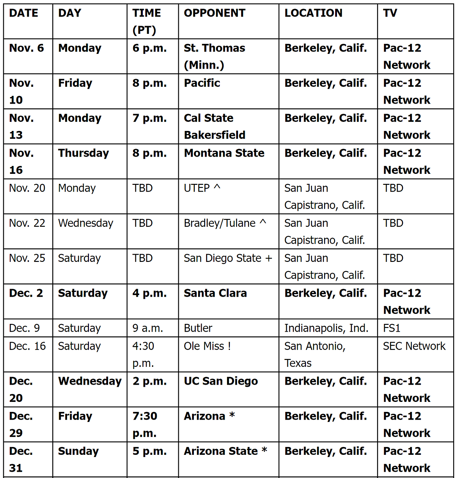 The Bears start the season at home with a 4 game homestand starting on November 6th with St. Thomas followed by Pacific, Cal State Bakersfield and Montana state. They then travel to San Juan Capistrano for the SoCal Challenge and Showcase game, before wrapping up the out of conference schedule with games against Santa Clara, Butler, Ole Miss and UCSD. The Pac-12 schedule then starts with a homestand against the Arizona schools. Senior day is scheduled for February 10th against Oregon, with the Bears ending their season with 3 road games against Colorado, Utah then Stanford.