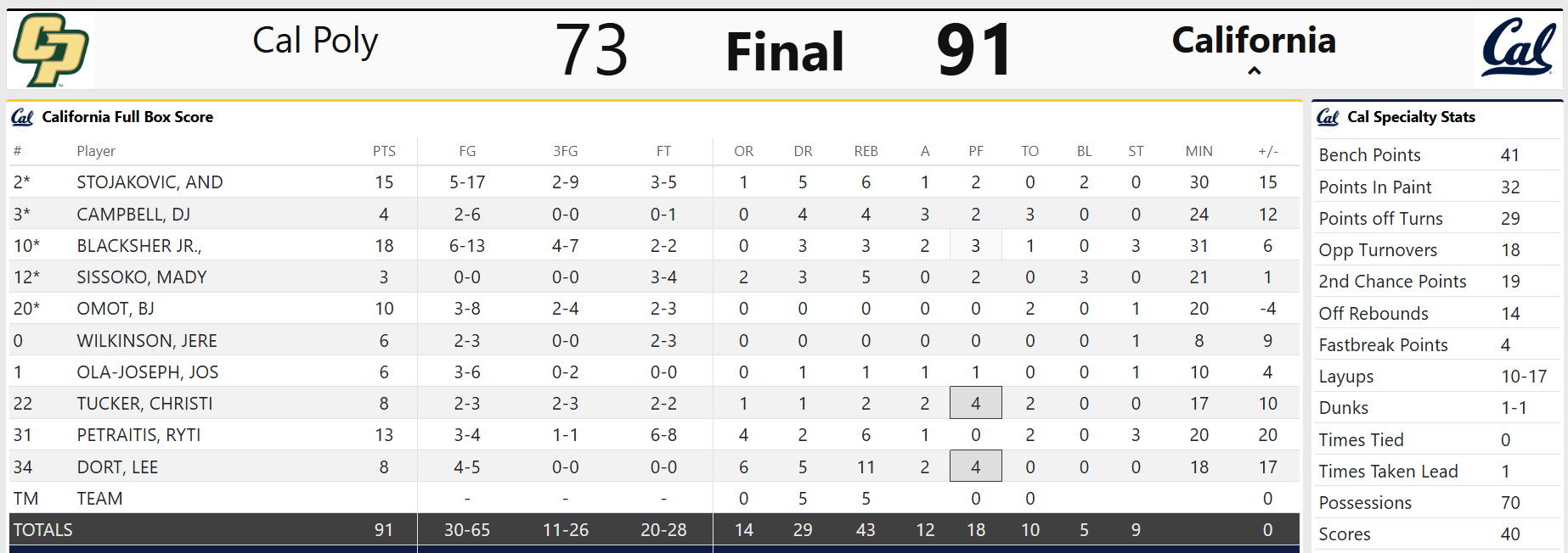 Cal became complacent over the next few minutes, allowing Cal Poly to cut the lead to 12 on a couple of occasions. Rytis Petraitis absorbed 2 charge calls by the Mustangs, and an alley-oop pass from DJ Campbell to Lee Dort got the team and crowd re-engaged. Cal held steady from then on and cruised to a 91-73 win.